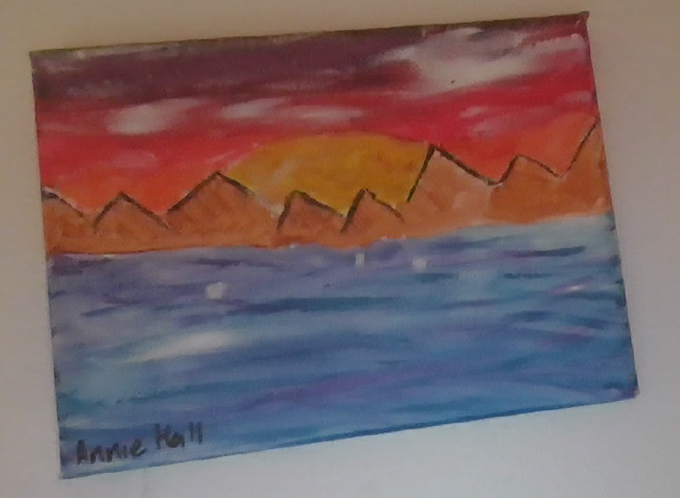 I painted this to remind me of my days in Colorado it is a painting of the mountains over a lake at sunset