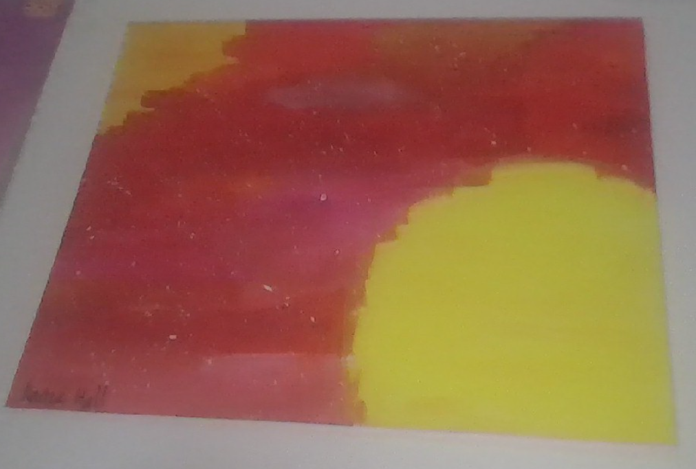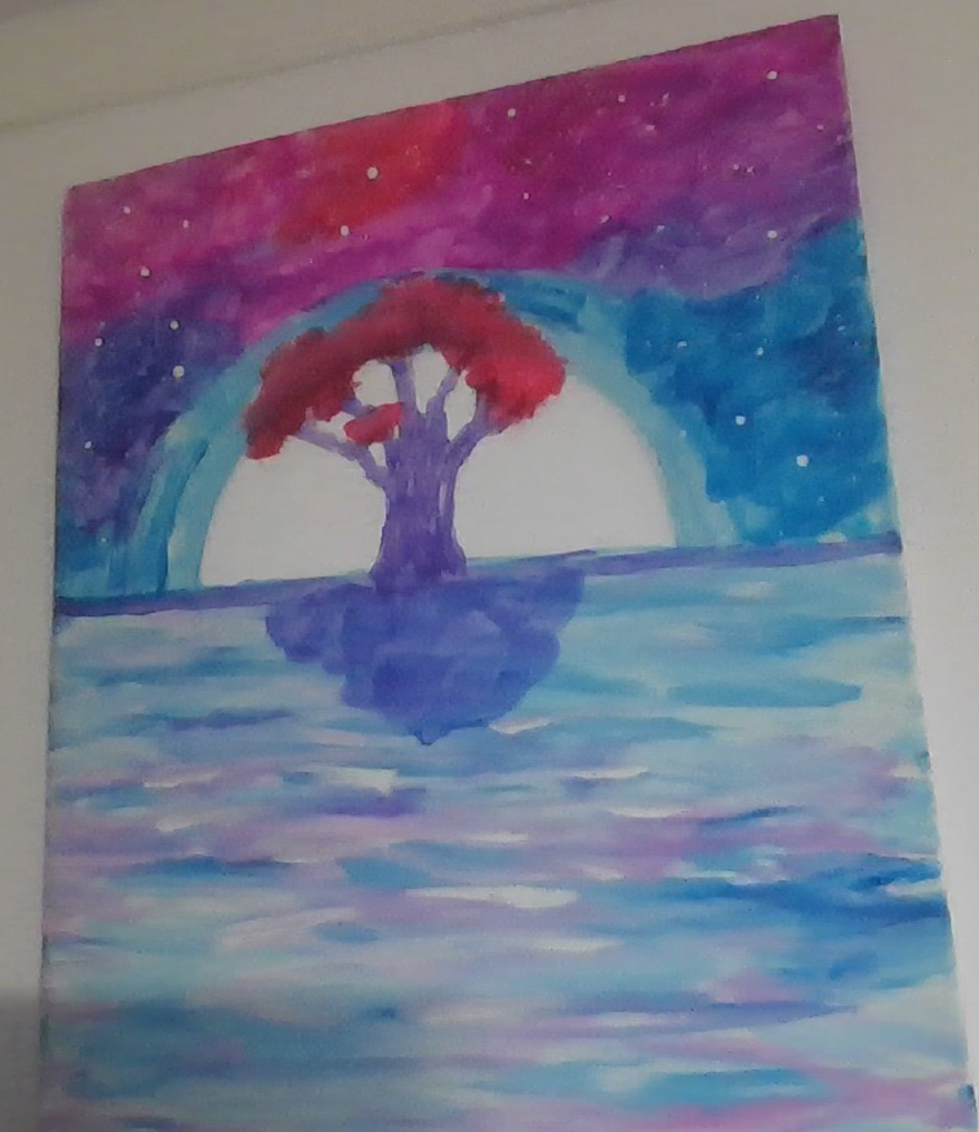 I painted this in paint that reflects black light which means that it glows in black light it is of an island with a tree in the middle of the night
